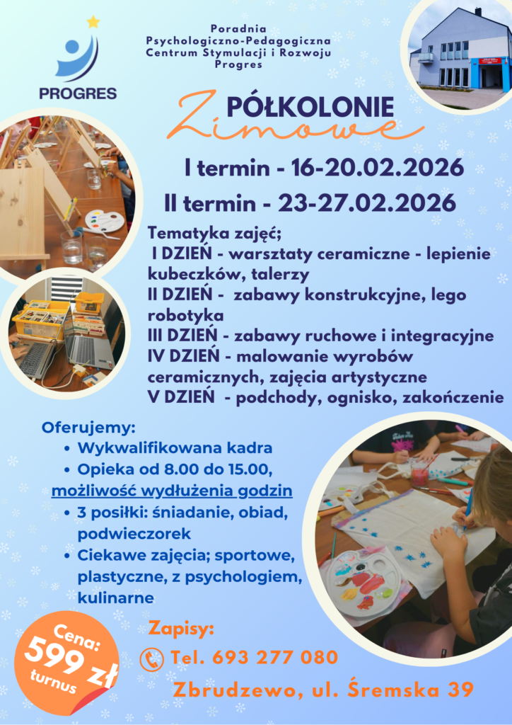 Zapraszamy na półkolonie w Centrum Progres. Czeka na was wykwalifikowana kadra opiekunów, ciekawe zajęcia o szerokiej tematyce, mnóstwo zabawy i śmiechu z nowo poznanymi kolegami i koleżankami! Czy twoje dziecko jest w wieku od 5 do 12 lat i nie wiesz jak zorganizować mu czas podczas wakacji? Zapisz je na półkolonie w Centrum Progres.